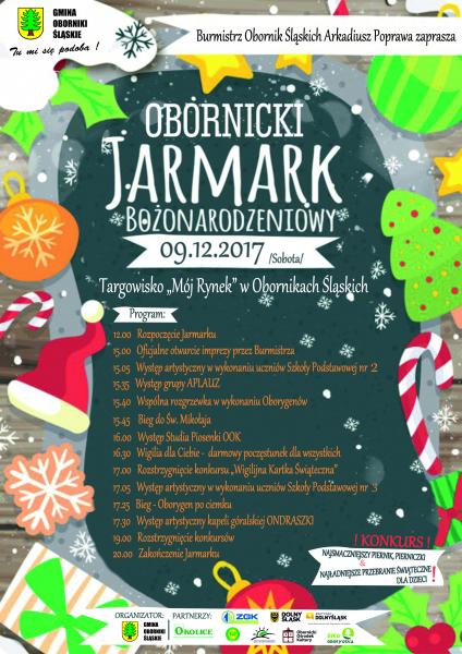 Burmistrz Obornik Śląskich Arkadiusz Poprawa zaprasza wszystkich sympatyków oraz przyjaciół Gminy Oborniki Śląskie na Obornicki Jarmark Bożonarodzeniowy, który odbędzie się 9 grudnia 2017 w naszym mieście. Początek wydarzenie odbędzie się o godzinie 12.00 i potrwa do godziny 20.00. W programie nie zabraknie występów dzieci ze szkół, biegu do św. Mikołaja czy wigilii dla Ciebie.