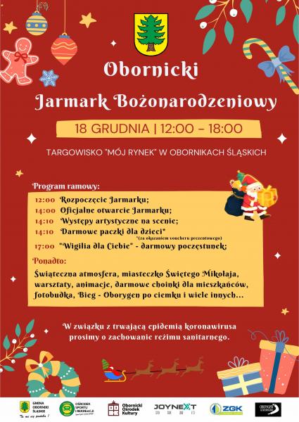 Przed nami Obornicki Jarmark Bożonarodzeniowy! W sobotę 18 grudnia targowisko miejskie zmieni się w miasteczko Świętego Mikołaja, na którym odbędą się warsztaty i animacje dla najmłodszych, a także będzie można zrobić sobie pamiątkowe zdjęcie w fotobudce. Poza tym organizatorzy zapewnią występy artystyczne, stoiska promocyjne, darmowy poczęstunek, a dla spragnionych sportowych endorfin odbędzie się kolejna edycja Biegu Oborygena po ciemku. Zapraszamy!