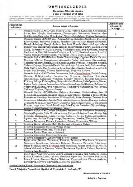 OBWIESZCZENIE Burmistrza Obornik Śląskich z dnia 24 sierpnia 2018 roku. Na podstawie art. 422 ustawy z dnia 5 stycznia 2011 r. – Kodeks wyborczy (Dz. U. z 2018 r. poz. 754, 1000 i 1349) Burmistrz Obornik Śląskich podaje do publicznej wiadomości informację o okręgach wyborczych, ich granicach i numerach, liczbie radnych wybieranych w okręgach wyborczych oraz siedzibie Miejskiej Komisji Wyborczej w Obornikach Śląskich w wyborach do Rady Miejskiej w Obornikach Śląskich zarządzonych na dzień 21 października 2018 r.: