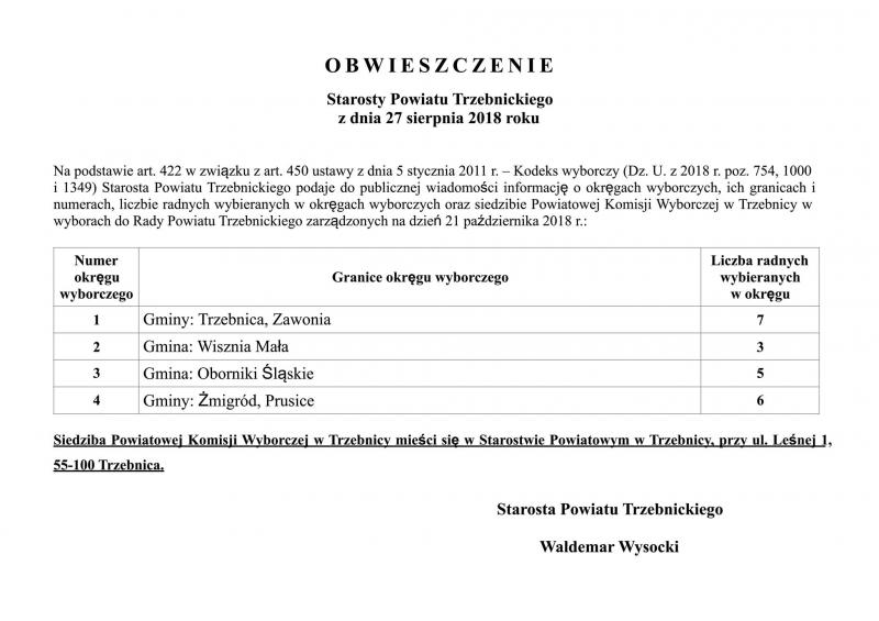 Obwieszczenie Starosty Powiatu Trzebnickiego w sprawie okręgów wyborczych, ich granic, numerów, liczbie radnych oraz siedzibie Powiatowej Komisji Wyborczej w Trzebnicy.