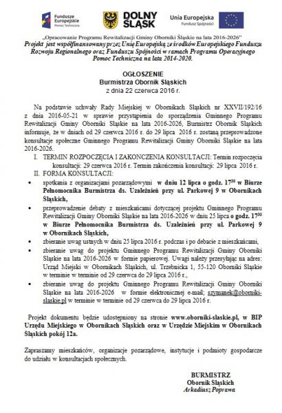 Na podstawie uchwały Rady Miejskiej w Obornikach Śląskich nr XXVII/192/16 z dnia 2016-05-21 w sprawie przystąpienia do sporządzenia Gminnego Programu Rewitalizacji Gminy Oborniki Śląskie na lata 2016-2026, Burmistrz Obornik Śląskich informuje, że w dniach od 29 czerwca 2016 r. do 29 lipca  2016 r. zostaną przeprowadzone konsultacje społeczne Gminnego Programu Rewitalizacji Gminy Oborniki Śląskie na lata 2016-2026.