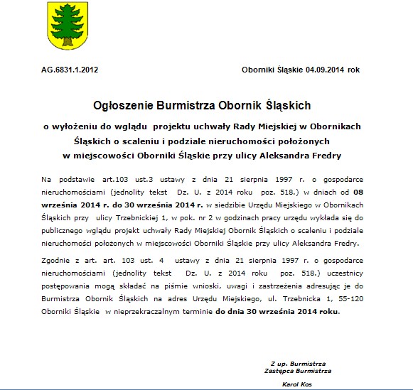 Ogłoszenie Burmistrza Obornik Śląskich o wyłożeniu do wglądu projektu uchwały Rady Miejskiej w Obornikach Śląskich o scaleniu i podziale nieruchomości położonych w miejscowości Oborniki Śląskie przy ulicy Aleksandra Fredy.