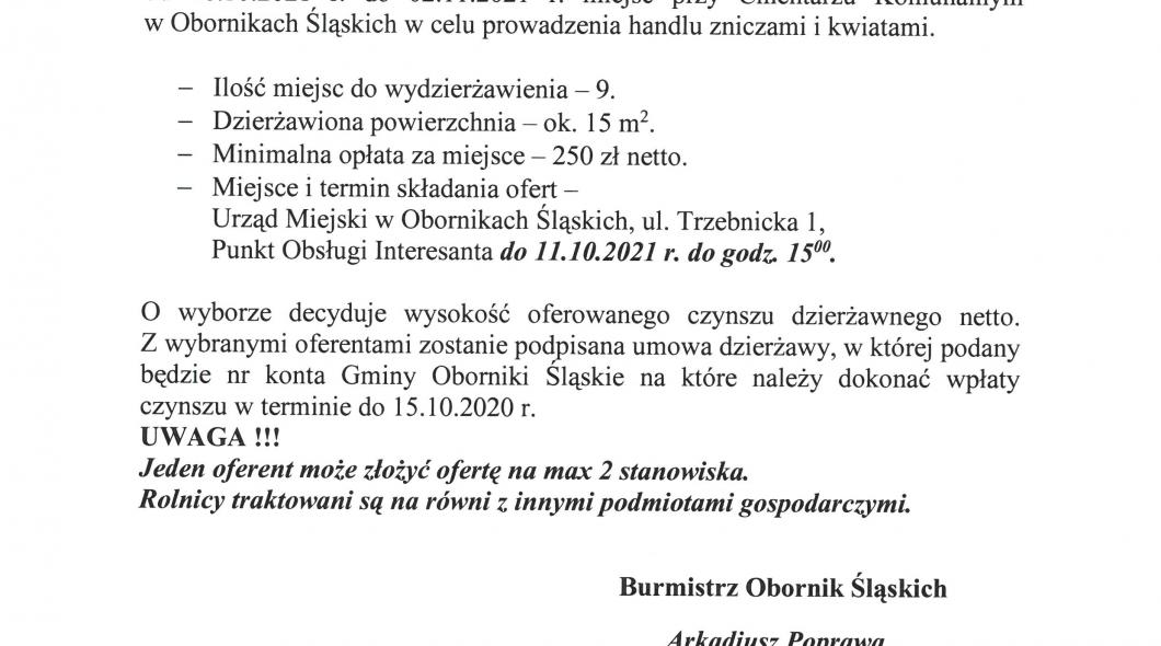 Ogłoszenie dotyczące składania ofert na dzierżawę miejsc przy Cmentarzu | Oficjalny serwis Gminy Oborniki Śląskie
