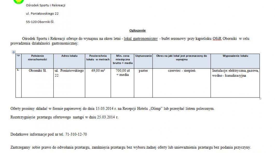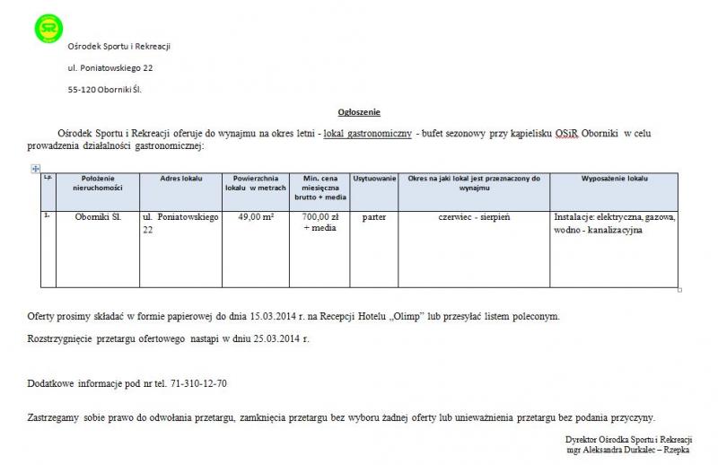 Ośrodek Sportu i Rekreacji w Obornikach Śląskich zaprasza do skladania ofert na wynajem w okresie letnim lokalu gastronomicznego przy kąpielisku OSiR w Obornikach Śląskich przy ulicy Poniatowskiego 22. Termin składania ofert: 15 marca 2014r.