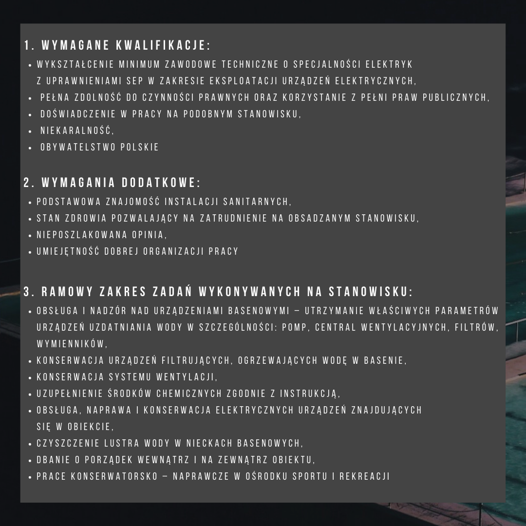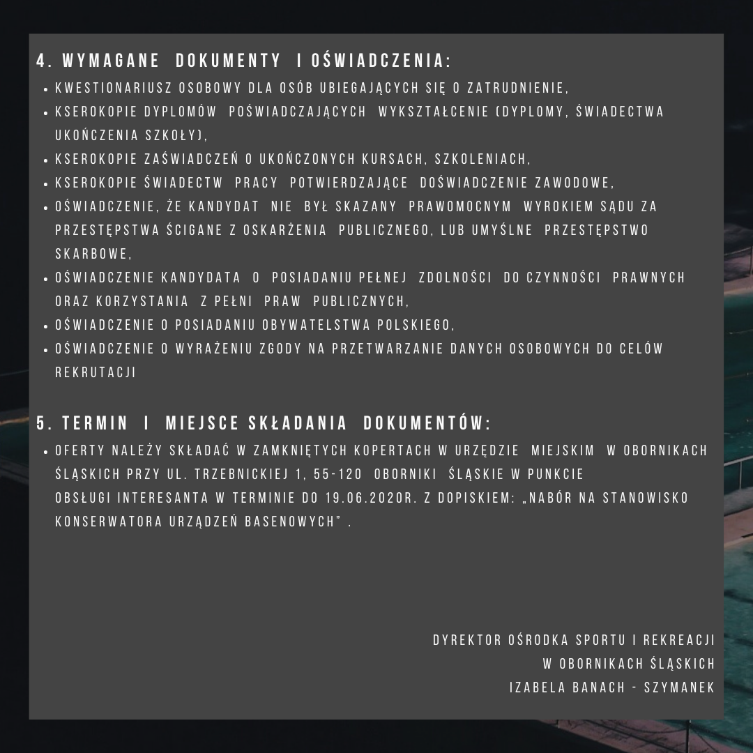 Ośrodek Sportu i Rekreacji w Obornikach Śląskich ogłasza nabór na stanowisko konserwatora urządzeń basenowych w Obornikach Śląskich. Niezbędne wymagania oraz zakres obowiązków znajduje się w załączeniu. Ofertę należy złożyć w zamkniętej kopercie w Urzędzie Miejskim w terminie do 19 czerwca 2020r. z dopiskiem "Nabór na stanowisko konserwatora urządzeń basenowych".