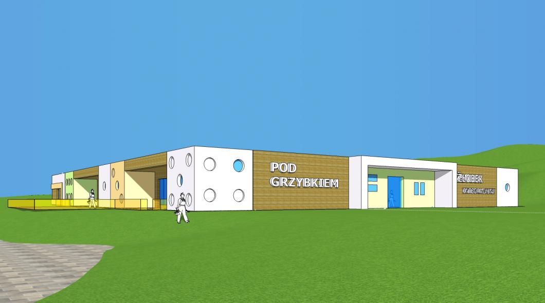 w postaci brył nawiązujących wyglądem do kostki sześciennej do gry z charakterystycznymi, okrągłymi wgłębieniami. Niektóre z okrągłych wgłębień będą pełniły funkcję okien doświetlających łazienki dzieci. Ze względu na przeznaczenie na elewacjach budynku planuje się wprowadzić kolorystykę pastelową w delikatnych, ciepłych odcieniach beżu, „zielonego groszku” oraz białą. Część elewacji będzie w kolorystyce naturalnego, jasnego drewna. Nad częścią pomieszczeń planuje się wykonanie świetlików dachowych pełniących funkcję doświetlającą.