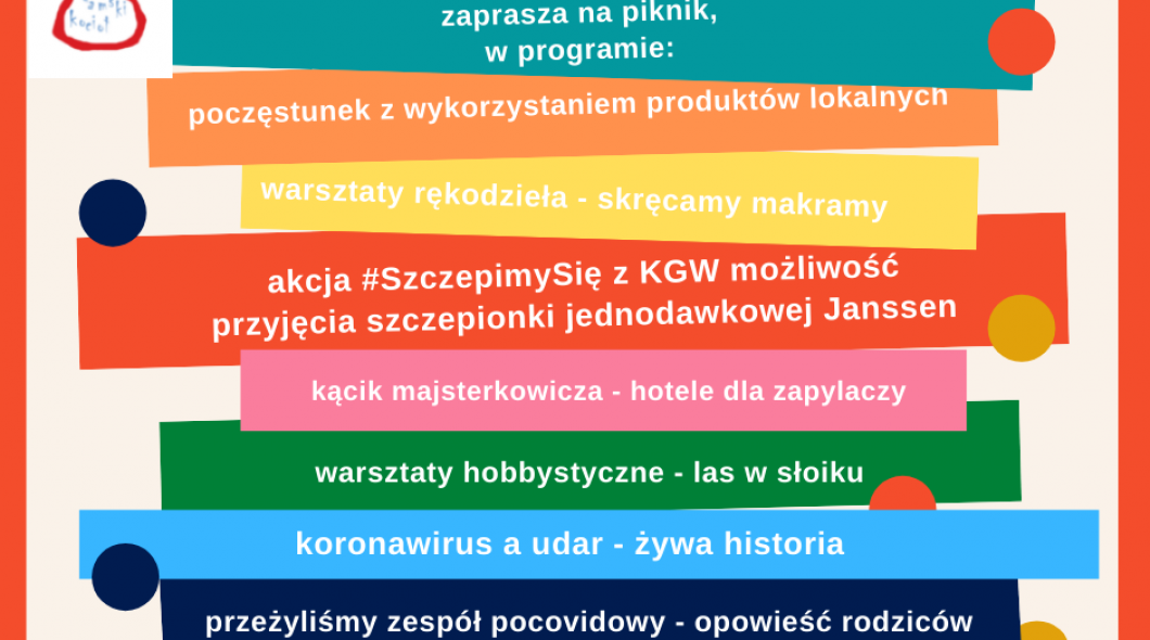 Koło Gospodyń Wiejskich "Damski Kocioł" w Pęgowie zaprasza na piknik "Liczy się zdrowie", który odbędzie się 29 sierpnia 2021 w godzinach 12-17 przed świetlicą wiejską w Pęgowie. W programie organizatorzy przewidzieli wiele atrakcji m.in.: akcja szczepimy się, kącik majsterkowicza, poczęstunek i wiele innych.