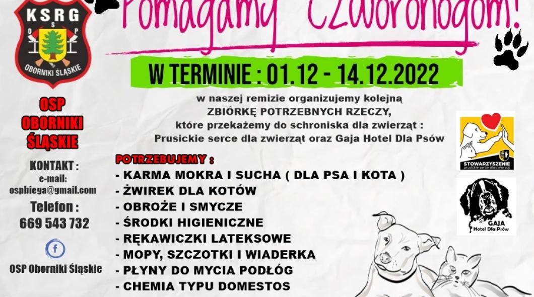 Tradycyjnie, jak co roku Strażacy z OSP Oborniki Śląskie prowadzą zbiórkę najpotrzebniejszych rzeczy dla zwierzaków w schroniskach. W terminie od 1 do 14 grudnia do remizy można przynosić: