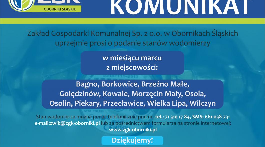Zakład Gospodarki Komunalnej prosi o podanie stanów wodomierzy w marcu br. z miejscowości: