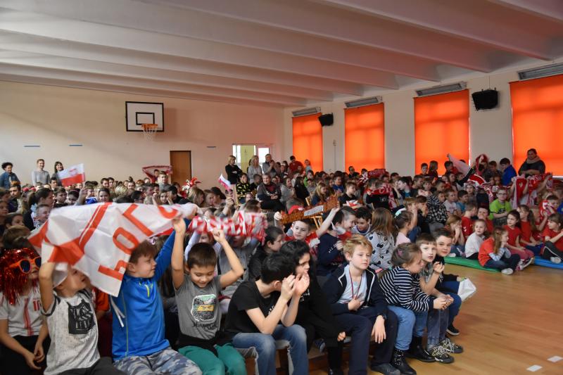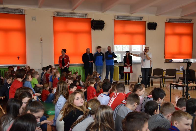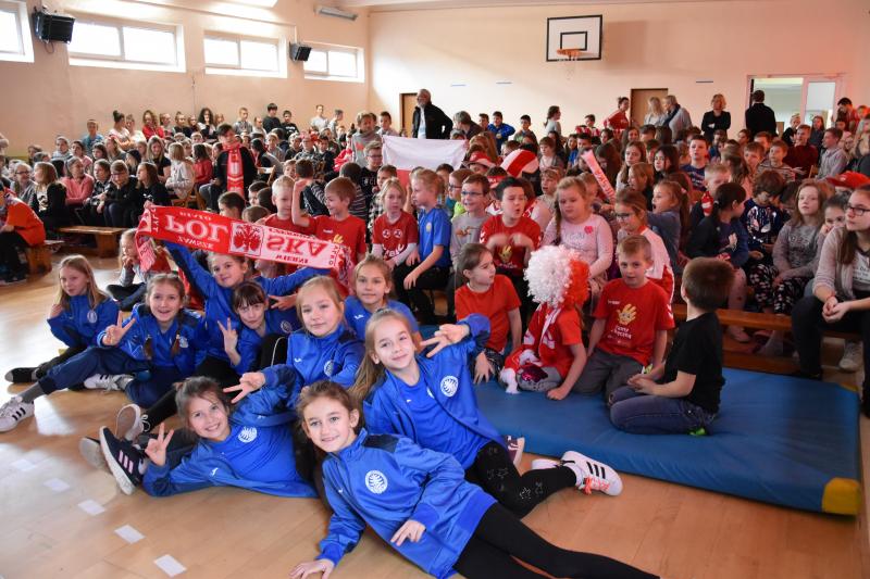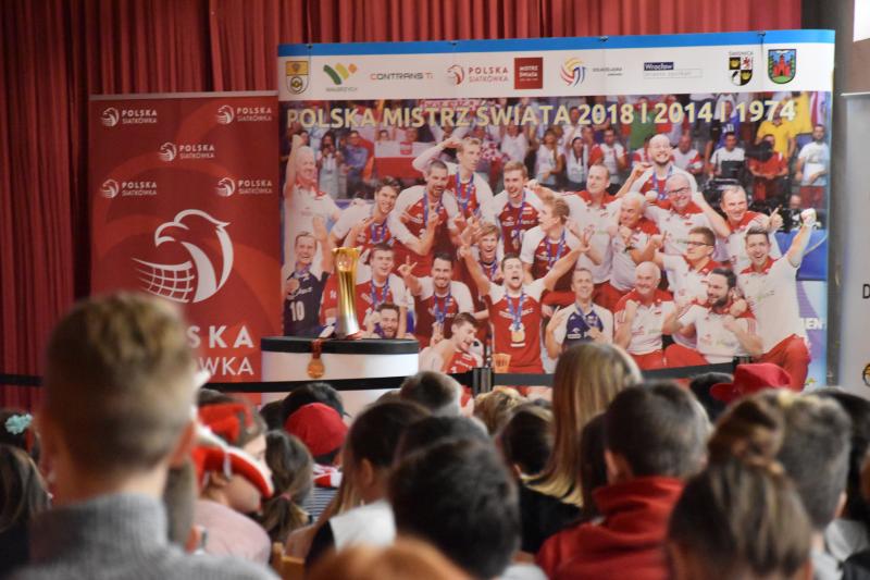 Radość, podekscytowanie, uśmiechy na twarzach najmłodszych, barwy narodowe, to wszystko można było zobaczyć podczas prezentacji najcenniejszego trofeum w piłce siatkowej - Pucharu Świata, który wywalczyła Reprezentacja Polski Siatkarzy w 2018 r podczas Mistrzostw Świata. Prelekcja była świetną okazją do zrobienia sobie pamiątkowych zdjęć oraz wysłuchania historii polskiej siatkówki. Nie zabrakło również konkursów z nagrodami. Uśmiechy na twarzach dzieci są dowodem na to, że była to cenna lekcja wychowania fizycznego, którą zapamiętają na długo.