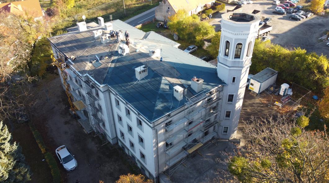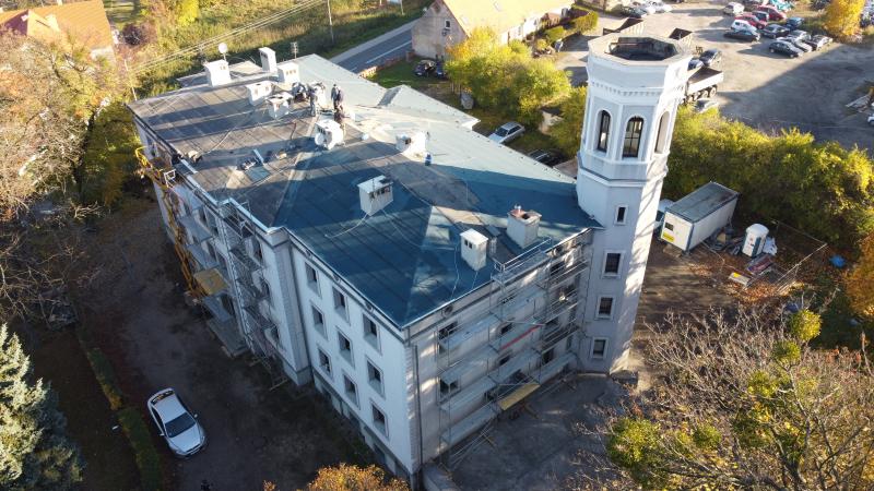 Trwa remont pokrycia dachu o konstrukcji drewnianej budynku wielorodzinnego przy ul, Podzamcze 7 w Obornikach Śląskich. Prace polegają na: zerwaniu starej popękanej papy składającej się z dwóch warstw, rozebraniu obróbek blacharskich wraz z demontażem haków rynnowych i rynien oraz demontażem wsporników odgromowych wraz z instalacją odgromową która zostanie ponownie wbudowana. Następnym etapem w remoncie dachu będzie ułożenie płyt OSB gr 22 mm. Na których zostaną ułożone dwie warstwy papy termozgrzewalnej. Koszt remontu dachu opiewa na kwotę blisko 292 500 zł. Zadanie w całości finansowane jest z budżetu gminy.
