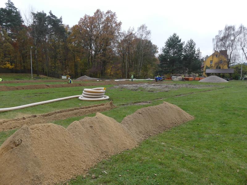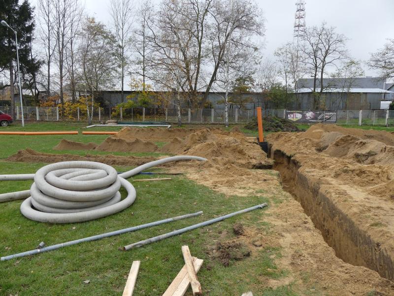 W tej chwili wykonywane są prace odwodnieniowe polegające na układaniu drenażu pod murawy boisk.