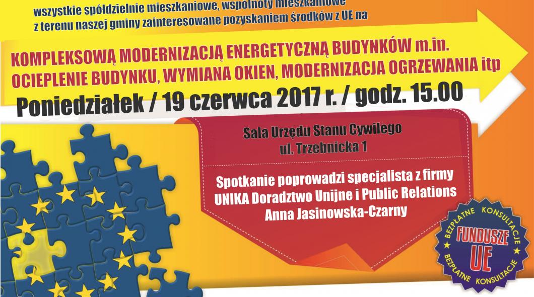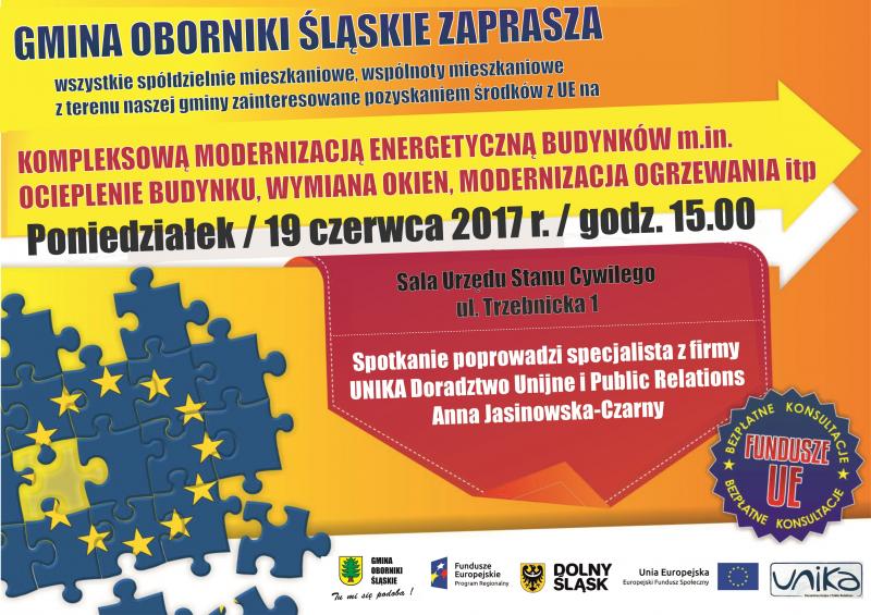 Gmina Oborniki Śląskie zaprasza wszystkie współdzielnie mieszkaniowe, wspólnoty mieszkaniowe z terenu naszej gminy zainteresowane pozyskaniem środków z UE na spotkanie w sprawie kompleksowej modernizacji energetycznej budynków m.in. ocieplanie budynków, wymiana okien, modernizacja ogrzewania itp... Spotkanie odbędzie się w Poniedziałek 19 czerwca 2017r. o godzinie 15.00 w Urzędzie Stanu Cywilnego w Obornikach Śląskich.  Spotkanie poprowadzi specjalista z firmy UNIKA Doradztwo Unijne i Public Relations Anna Jasinowska - Czarny.