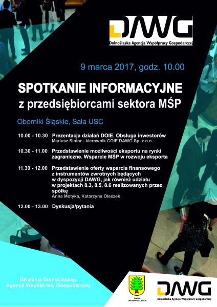 Burmistrz Obornik Śląskich razem z Dolnośląską Agencją Współpracy Gospodarczej (DAWG) zapraszamy na spotkanie informacyjne dla przedsiębiorców sektora MŚP. Podczas prelekcji zostaną przedstawione możliwości eksportu na rynki zagraniczne oraz oferty wsparcia finansowego. Początek spotkania 9 marca 2017 r o godzinie 10.00 w Urzędzie Stanu Cywilnego w Obornikach Śląskich.