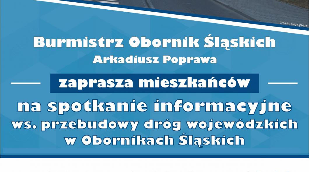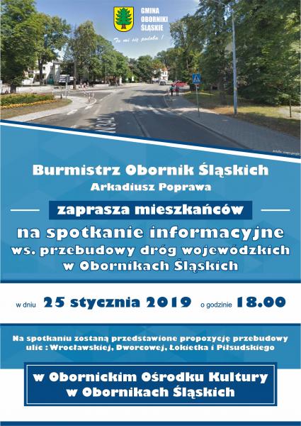 Burmistrz Obornik Śląskich Arkadiusz Poprawa zaprasza mieszkańców na spotkanie informacyjne w sprawie przebudowy dróg wojewódzkich na terenie Obornik Śląskich, które odbędzie się 25 stycznia 2019 o godzinie 18.00 w Obornickim Ośrodku Kultury. Na spotkaniu zostaną przedstawione propozycje przebudowy ulic: Wrocławskiej, Dworcowej, Łokietka i Piłsudskiego.