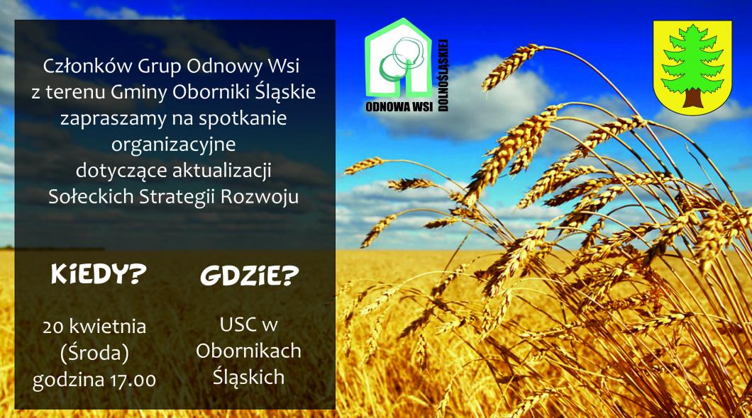 Gmina Oborniki Śląskie w środę 20 kwietnia 2016 roku w sali Urzędu Stanu Cywilnego w Obornikach Śląskich organizuje spotkanie dotyczące aktualizacji Sołeckich Strategii Rozwoju. Na warsztaty zapraszamy Liderów wraz z członkami Grup Odnowy Wsi (min. 2 osoby z Sołectwa). Podczas spotkania omówione zostaną kwestie dotyczące aktualizacji strategii, ustalone zostaną terminy spotkań warsztatowych dla poszczególnych Sołectw oraz rozdane zostaną materiały do zaktualizowania przez mieszkańców poszczególnych wsi.