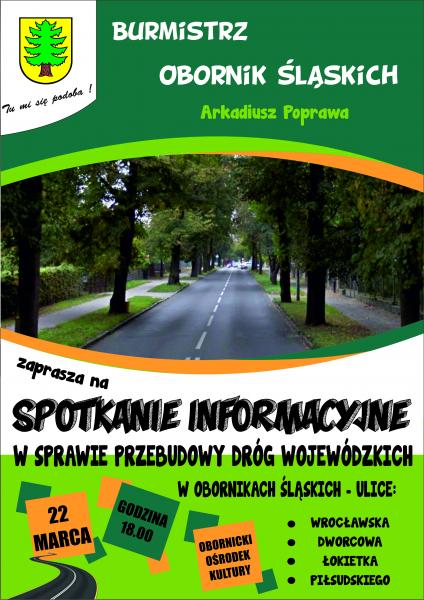 Szanowni Państwo! Burmistrz Obornik Śląskich Arkadiusz Poprawa zaprasza na spotkanie informacyjne, które dotyczyć będzie przebudowy dróg wojewódzkich w Obornikach Śląskich. Termin spotkania został wyznaczony na 22 marca 2017 r. godzina 18.00 w Obornickim Ośrodku Kultury.