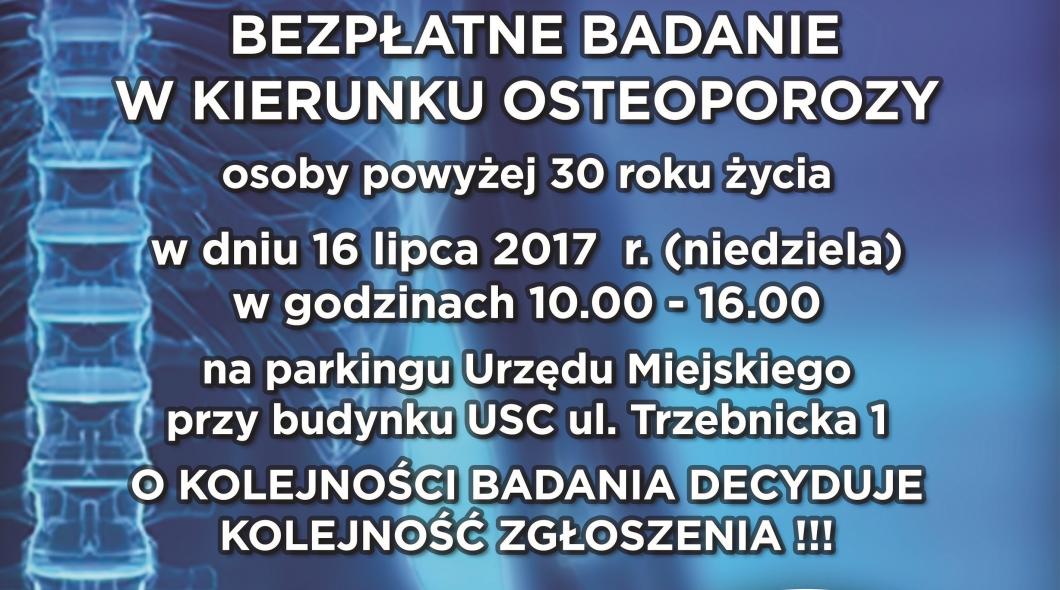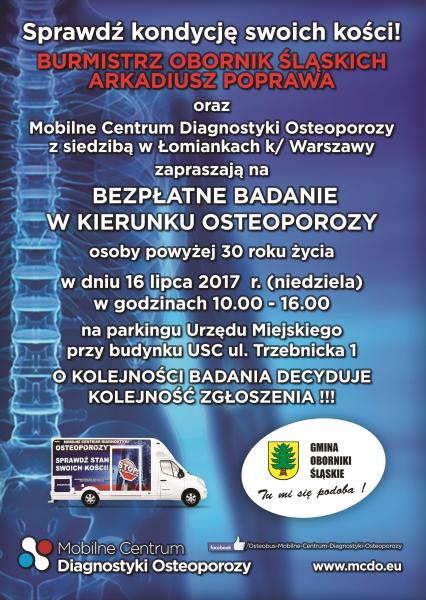 Burmistrz Obornik Śląskich Arkadiusz Poprawa oraz Mobilne Centrum Diagnostyki Osteoporozy zapraszają na bepłatne badania w kierunku osteoporozy dla osób powyżej 30 roku życia. Badania odbędą się w dniu 16 lipca 2017 w niedziele w godzinach 10-16 na parkingu przy Urzędzie Miejskim.