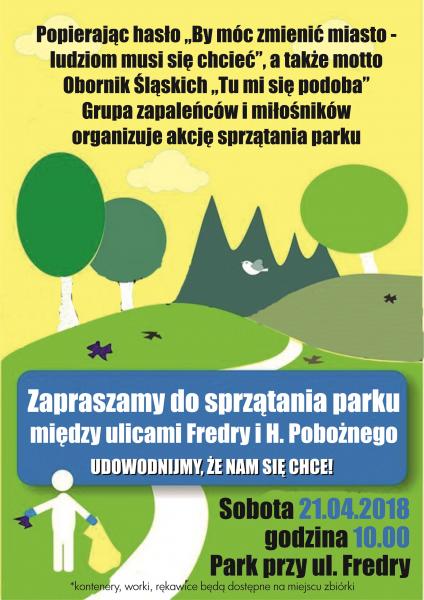 Popierając hasło "By móc zmienić miasto - ludziom musi się chcieć", a także motto Obornik Śląskich "Tu mi się podoba". Grupa zapaleńców i miłośników organizuje akcję sprzątania parku przy ulicy Fredry i H. Pobożnego. Sprzątanie rozpocznie się w sobotę 21 kwietnia o godzinie 10.00. Kontener, worki, rękawice będą dostępne na miejscu zbiórki.