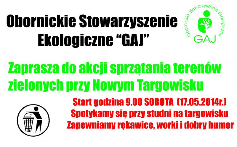 Obornickie Stowarzyszenie Ekologiczne GAJ zaprasza do akcji sprzątania terenów zielonych przy Nowym Targowisku. Start Akcji godzina 9.00 SOBOTA (17.05.2014r.) Spotykamy się przy studni na targowisku. Zapewniamy rękawice, worki i dobry humor ;)