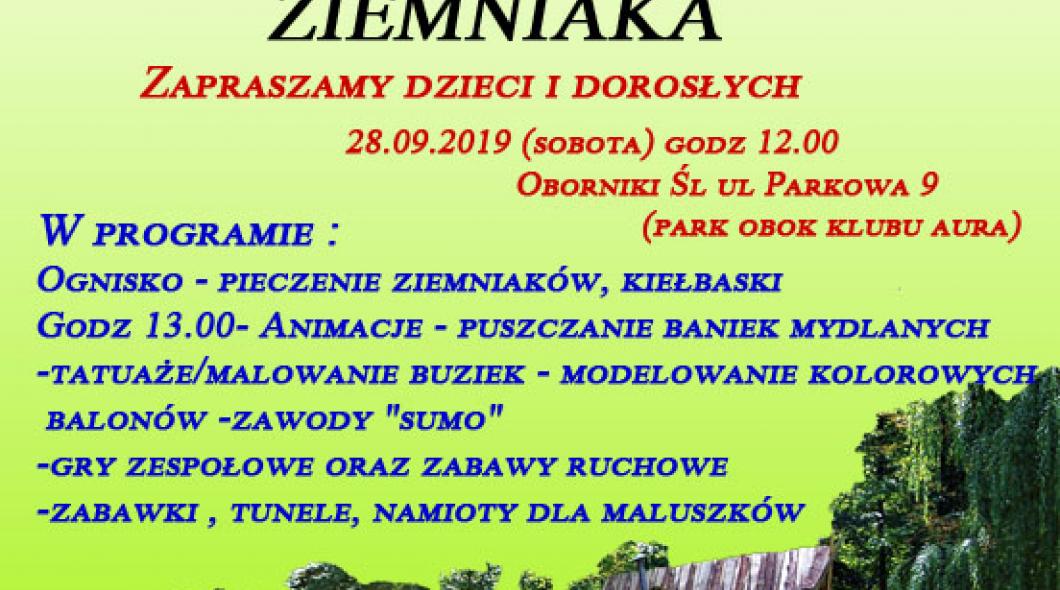 Stowarzyszenie Rodzin Abstynenckich AURA w Obornikach Śląskich zaprasza na Święto Pieczonego Ziemniaka w sobotę 28 września od godziny 12:00. W programie nie zabraknie animacji dla dzieci, malowania twarzy, czy gier zespołowych.