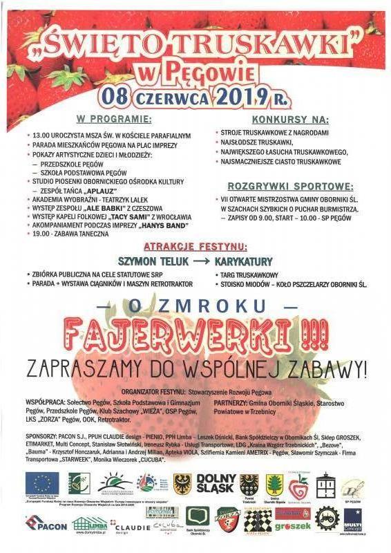 Stowarzyszenie Rozwoju Pęgowa zaprasza na coroczne Święto Truskawki do Pęgowa. Tegoroczne święto odbędzie się 8 czerwca 2019 r.