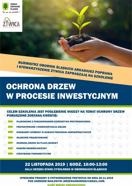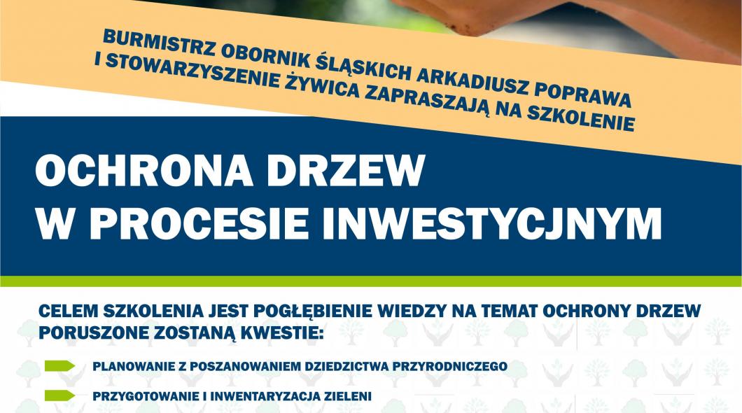 Burmistrz Obornik Śląskich Arkadiusz Poprawa i Stowarzyszenie Żywica zapraszają na szkolenie pt."Ochorona drzew w procesie inwestycyjnym, które odbędzie się 22 listopada 2019 w godzinach od 10:00-13:00 w sali Urzędu Stanu Cywilnego w Obornikach Śląskich. Celem spotkania jest pogłębienie wiedzy na temat ochrony drzew. Organizatorzy proszą o potwierdzenie przybycia do dnia 20 listopada 2019 na adres e-mailowy: drzewaoborniki@gmail.com