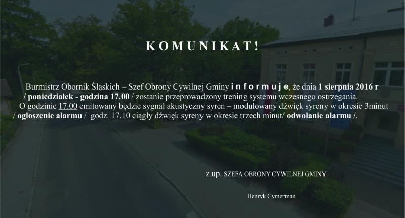 W poniedziałek 1 sierpnia 2016 roku na terenie Gminy Oborniki Ślaskie odbędzie się trening systemu wczesnego ostrzegania z wykorzystaniem syren akustycznych. W tym dniu włączone zostaną o godz. 17.00 syreny alarmowe w miejscowościach: Oborniki Śląskie, Rościsławice, Uraz, Pęgów ,Lubnów i Bagno i wyemitowany będzie sygnał akustyczny: