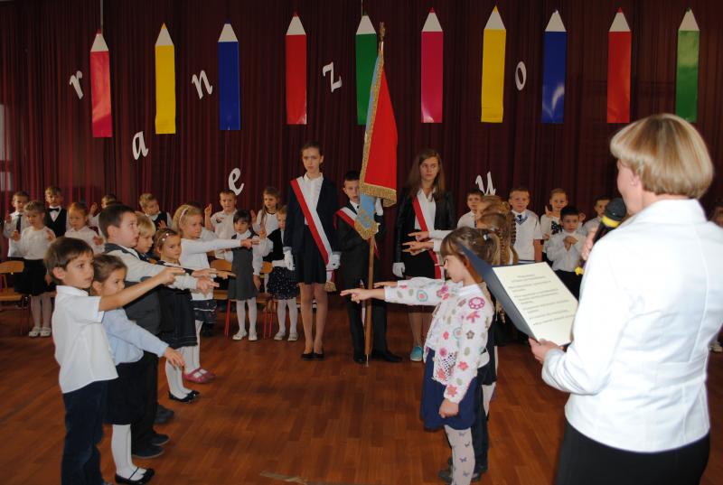 Na wstępie wszyscy mogli podziwiać wspaniałe występy pierwszaków, którzy pokazali w ten sposób swoją gotowość do ślubowania. Następnie został wprowadzony sztandar szkoły, przed którym przedstawiciele z klas pierwszych złożyli uroczyste ślubowanie odczytane przez dyrektora szkoły Jolantę Dudczenko.