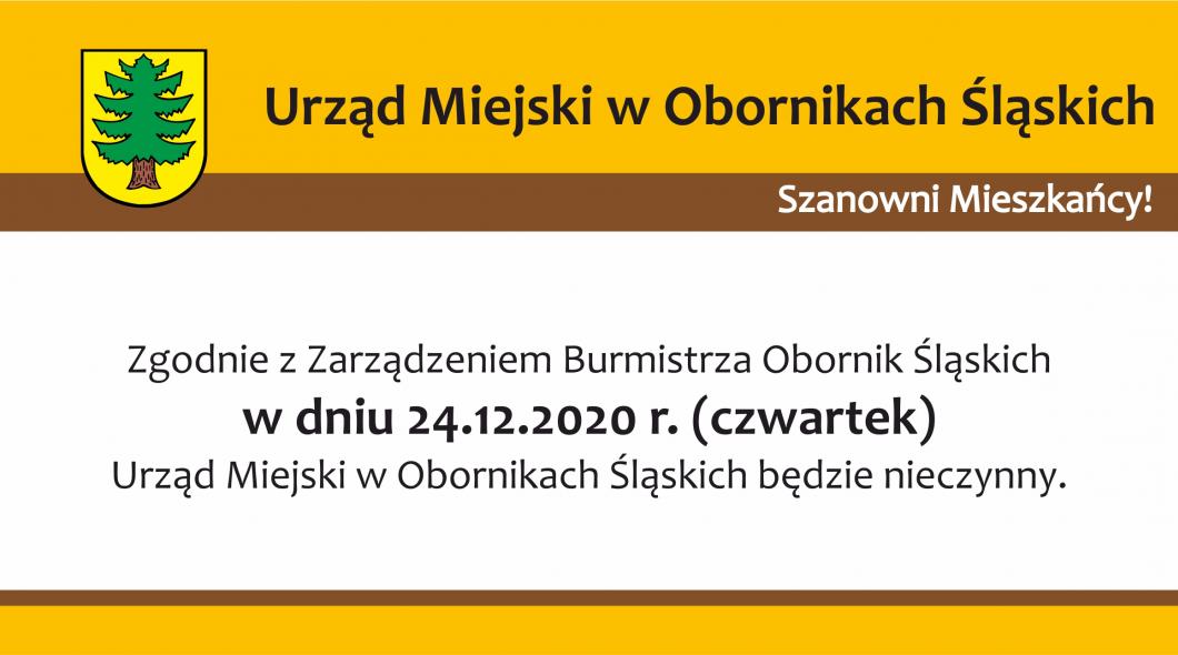 Zgodnie z Zarządzeniem Burmistrza Obornik Śląskich Urząd Miejski 24 grudnia (wigilia) będzie nieczynny.