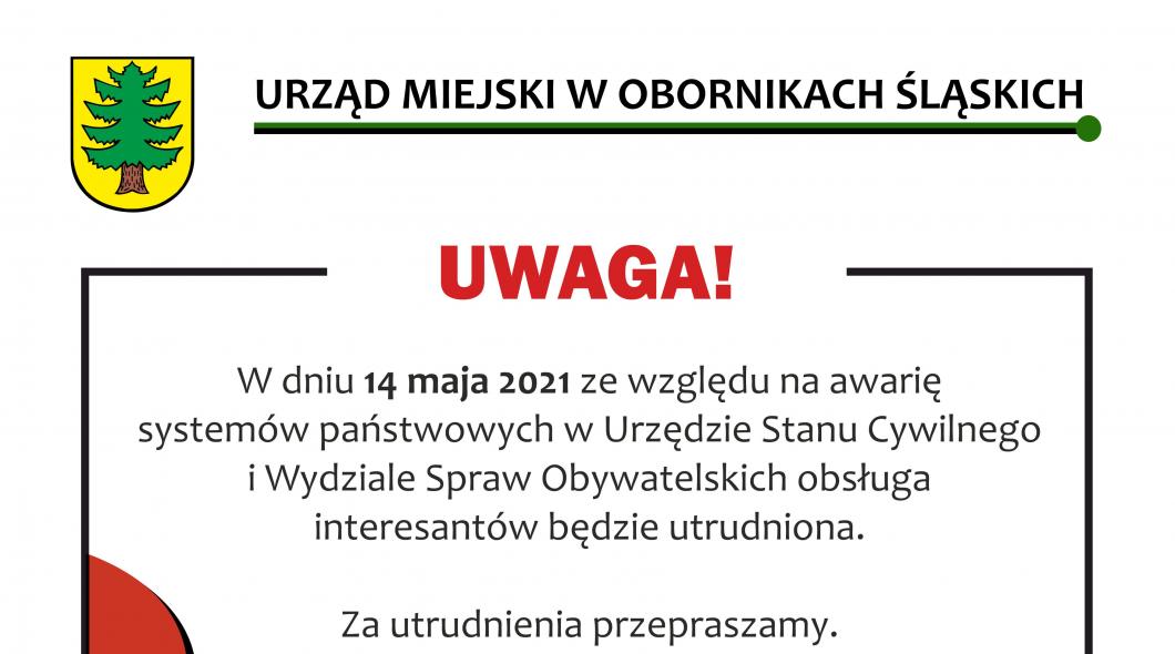 W dniu 14 maja 2021 ze względu na awarię systemów państwowych w Urzędzie Stanu Cywilnego i Wydziale Spraw Obywatelskich obsługa interesantów będzie utrudniona.