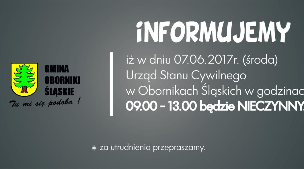 Informujemy, iż dnia 07.06.2017 r. (środa) w godzinach od 09.00 - 13.00 Urząd Stanu Cywilnego w Obornikach Śląskich będzie nieczynny.