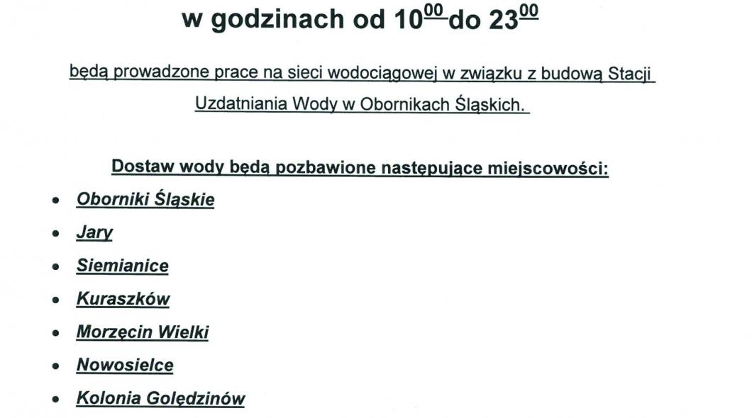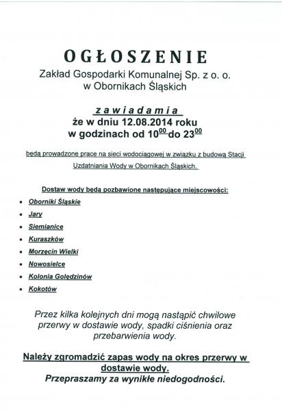 UWAGA! Brak wody w dniu 12.08.2014 w godzinach od 10:00 do 23:00 ! | Oficjalny serwis Gminy Oborniki Śląskie