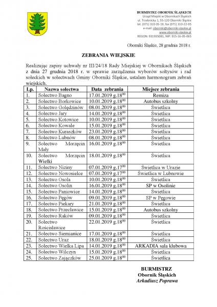 Uwaga! Uległy zmianie niektóre terminy zebrań wiejskich dotyczące wyborów sołtysów i rad sołeckich w Gminie Oborniki Śląskich. Prosimy o zapoznanie się z poniższą informacją.