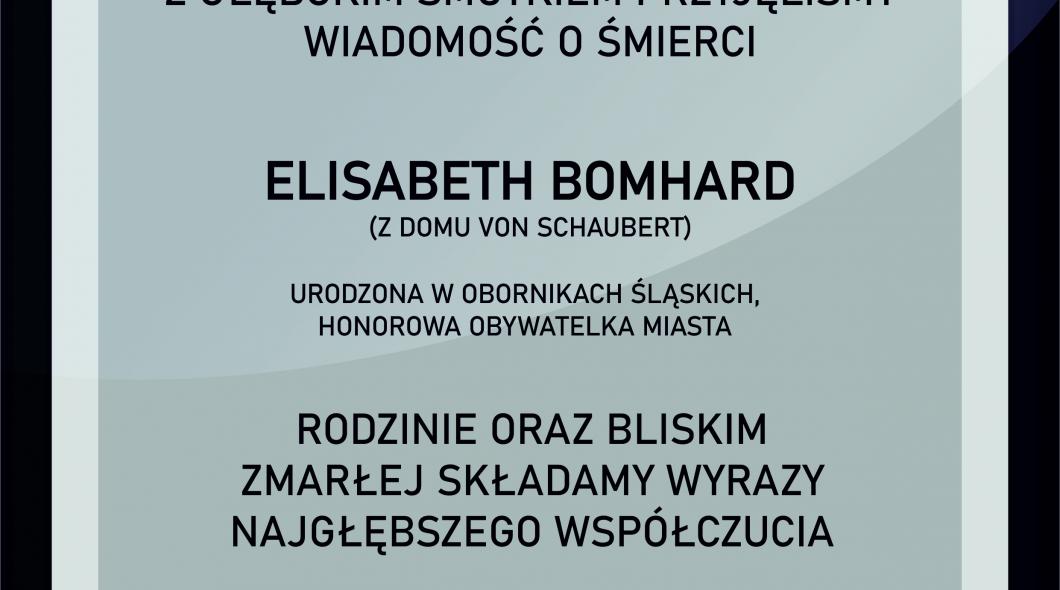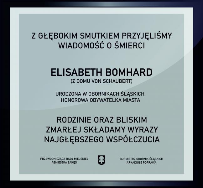 W dniu 4 września 2021 roku zmarła Elisabeth Bomhard z domu Schaubert (córka Ernsta Schauberta- ostatniego przedwojennego właściciela Obornik Śląskich), urodzona 12 sierpnia 1925 r. w Obornikach Śląskich. Od 2006 roku „Honorowa Obywatelka” naszego miasta. Od lat była orędowniczką budowania mostu zbliżenia, porozumienia i pojednania narodów polskiego i niemieckiego. W 2014 ukazała się książka jej autorstwa "Powrót do mego liścianego rowu", w której oczami małej dziewczynki opisuje swoje wspomnienia z dworu Schaubertów. Pani Bomhard od lat w naszej gminie wspierała pracę z dziećmi i młodzieżą w dziedzinie kultury.