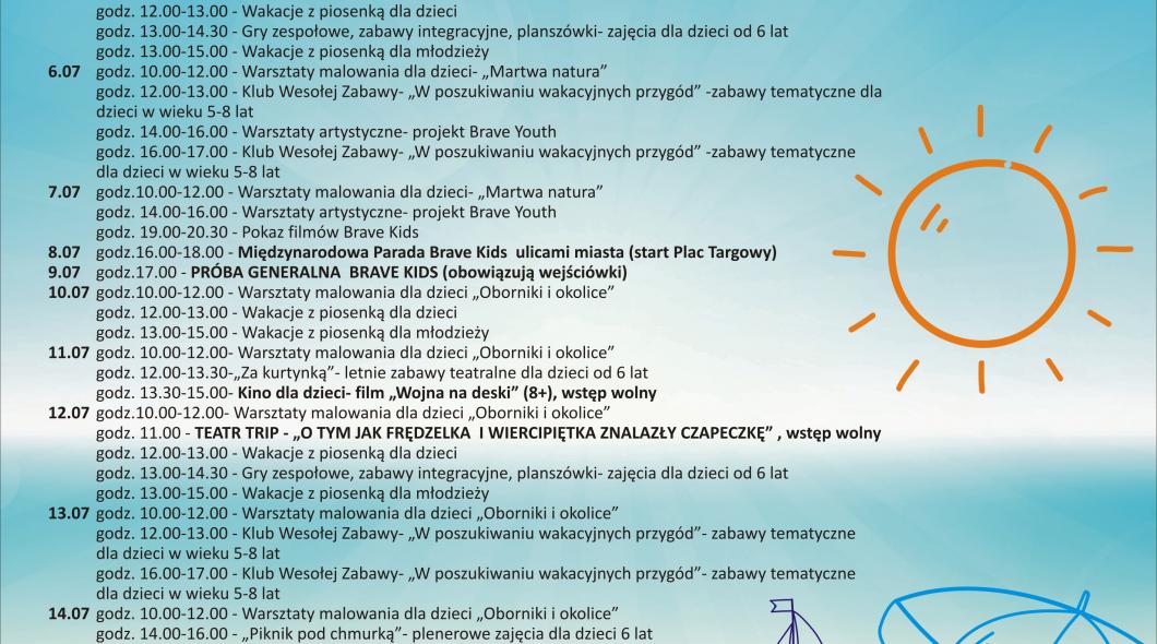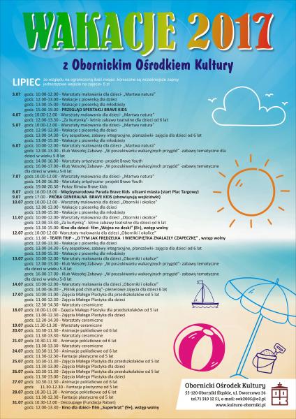 Wakacje oficjalnie rozpoczęte. Tych wszystkich, którzy zechcą spędzić czas aktywnie, zapraszamy do zapoznania się z wakacyjnymi propozycjami Obornickiego Ośrodka Kultury. Szczegóły na stronie internetowej: http://kultura-oborniki.pl/ook/wakacje-2017/.