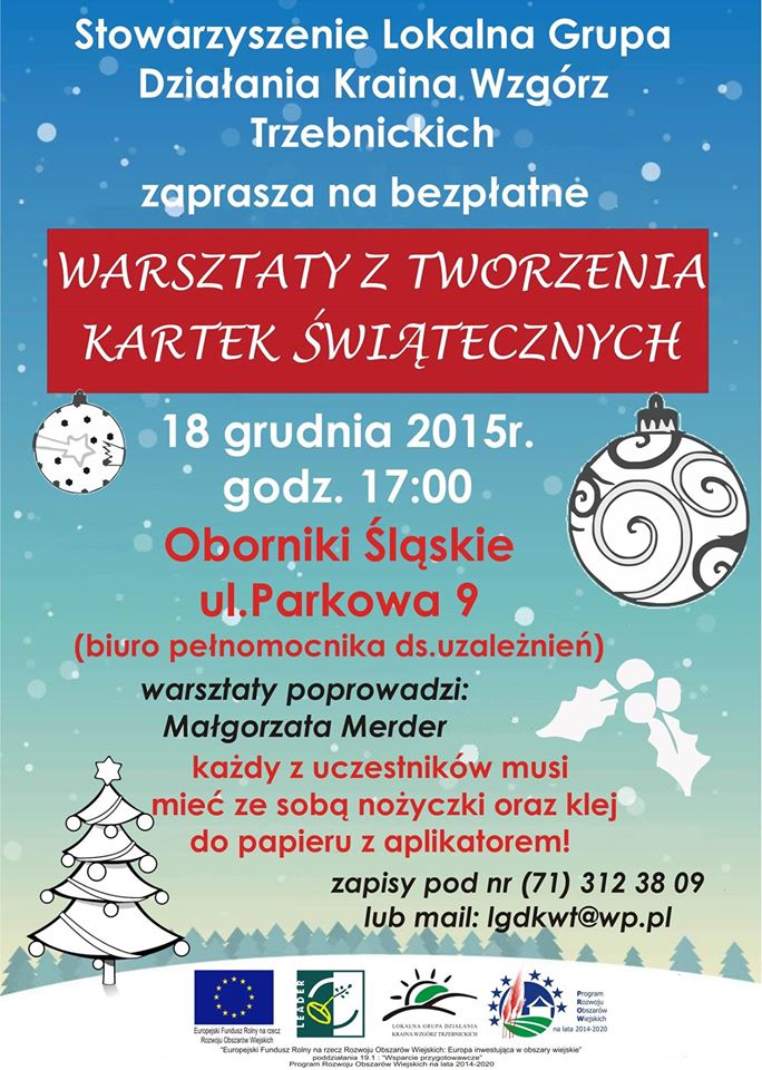 Mieszkańców Gminy Oborniki Śląskie 18 grudnia 2015 roku o godz. 17:00 zapraszamy do Biura Pełnomocnika ds. Uzależnień, przy ul. Parkowej 9 w Obornikach Śląskich na bezpłatne warsztaty z tworzenia kartek świątecznych!