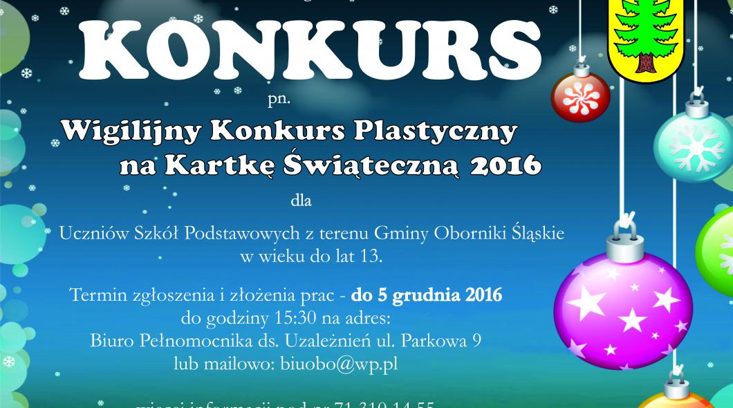 Przed nami kolejna edycja wigilijnego konkursy plastycznego na kartkę świąteczną dla szkół podstawowych z terenu gminy Oborniki Śląskie. Zachęcamy dzieci w wieku do 13 lat do złożenia prac w biurze Pełnomocnika Burmistrza ds. Uzależnień. Więcej informacji znajduje się w regulaminie konkursu, który jest dostępny TUTAJ. Oświadczenie opiekuna oraz karta zgłoszenia dostępna będzie w załączeniu.