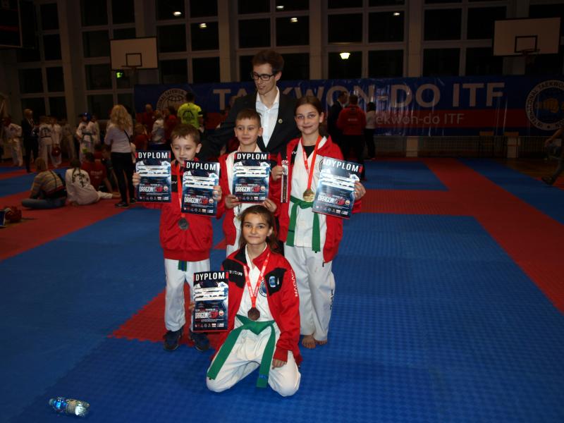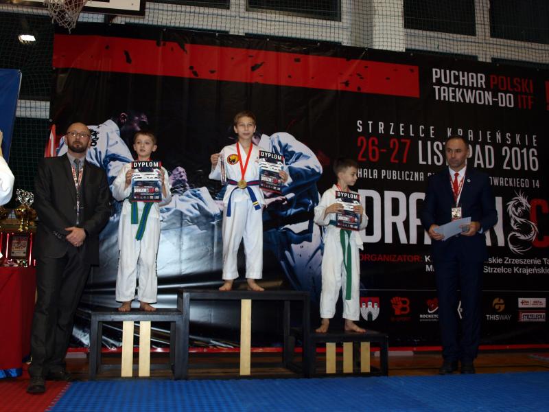 38 medali Avasatare na Pucharze Polski Taekwon-do ITF w Strzelcach Krajeńskich! Super sezon Taekwondo`ków z Avasatare został zwieńczony II miejscem w klasyfikacji generalnej Pucharu Polski Dragon Cup 2016 w Strzelcach Krajeńskich. Fighterzy z Brzegu Dolnego i Obornik Śląskich zdeklasowali konkurencje w układach kilkukrotnie zajmując wszystkie miejsca na podium w swoich kategoriach! W rozegranym w miniony weekend turnieju wystartowało ponad 411 zawodników z kilkunastu klubów. Ponownie, jak zresztą w całym mijającym roku, zawodnicy Avasatare nie zawiedli i ze Strzelec powrócili z 38 medalami! Zawody toczyły się w konkurencjach walk semi i light contact, układach formalnych oraz technikach specjalnych. Oborniki Śląskie reprezentowało 6 zawodników. Alicja Sapijaszko i Natalia Kamińska – kategoria Kadetów (10 lat pasy zielone z niebieską belką), Michał Sapijaszko i Mateusz Kamiński – kategoria Juniorzy Młodsi (13 lat pasy niebieske), Filip Krzemianowski – kategoria Kadetów (10 lat pasy zielone z niebieską belką) i Daniel Kasperkiewicz – kategoria Młodzicy (10 lat pasy żółte zieloną belką), którzy pokazali, że trenują ciężko i gotowi są na starcie w różnych konkurencjach. Zaowocowało to workiem medali.