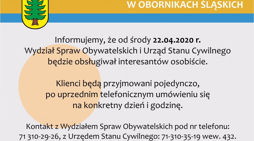 Uprzejmie informujemy, że od dnia 22.04.2020 r. Wydział Spraw Obywatelskich i Urząd Stanu Cywilnego będzie obsługiwał interesantów osobiście. Klienci będą przyjmowani pojedynczo, po uprzednim telefonicznym umówieniu się na konkretny dzień i godzinę. Kontakt z Wydziałem Spraw Obywatelskich pod nr telefonu: 71 310-29-26, z Urzędem Stanu Cywilnego: 71-310-35-19 wew. 432.