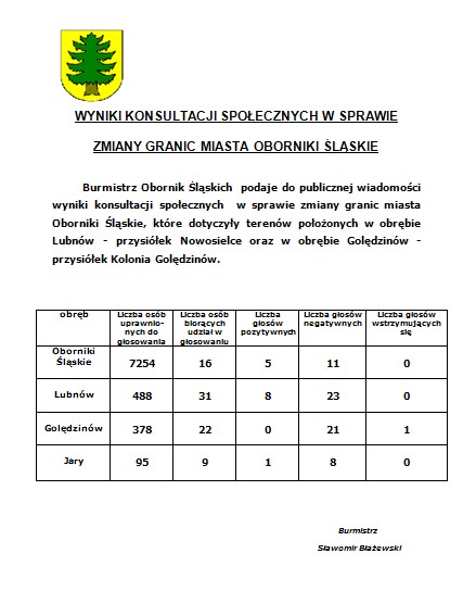 Burmistrz Obornik Śląskich podaje do publicznej wiadomości wyniki konsultacji społecznych w sprawie zmiany granic miasta Oborniki Śląskie, które dotyczyły terenów położonych w obrębie Lubnów - przysiółek Nowosielce oraz w obrębie Golędzinów - przysiółek Kolonia Golędzinów.