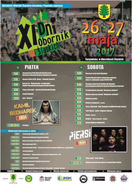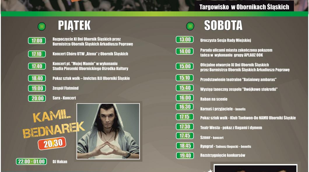 Burmistrz Obornik Śląskich Arkadiusz Poprawa zaprasza na kolejne, XI Dni Obornik Śląskich. Podczas tegorocznej edycji święta naszego miasta nie zabraknie wielu, wielu atrakcji dla każdego. Gwiazdą piątkowego wieczoru, która została "ochrzczona" mianem sceny dla młodych będzie Kamil Bednarek. Natomiast w sobotę zespół Piersi. Zatem jak śpiewa Adam Asanov - wokalista zespołu Piersi w swoim największym hicie "Bałkanica" - będzie, będzie zabawa, będzie się działo :)