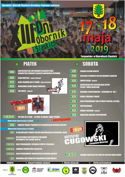 Przed nami kolejne, XIII Dni Obornik Śląskich. W tym roku zgromadzona publiczność będzie mogła posłuchać m.in:. dwa zespoły z naszego miasta, obejrzeć wystawę RetroMOTO, czy posłuchać gwiazdy wieczoru zespół Weekend . Natomiast sobota zapowada się bardziej rockowo - organizatorzy zapewnili dużo atrakcji. Gwiazdą sobotniego dnia będzie Krzysztof Cugowski. Zapraszamy!