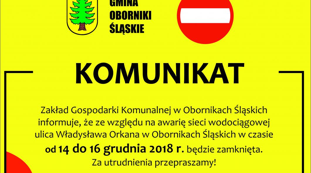 Zakład Gospodarki Komunalnej w Obornikach Śląskich informuje, że ze względu na awarię sieci wodociągowej ulica Władysława Orkana w Obornikach Śląskich w czasie od 14 do 16 grudnia 2018 r. będzie zamknięta.