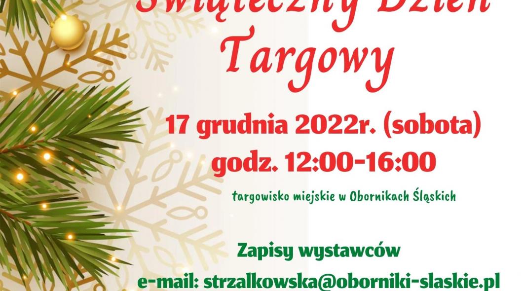 Wielkimi krokami zbliża się magiczny czas Świąt. W związku z tym zapraszamy rękodzielników i producentów lokalnych do zapisów na Świąteczny Dzień Targowy. Na zapisy czekamy czekamy do 15 grudnia pod adresem e-mailowym: strzalkowska@oborniki-slaskie.pl. Organizator zapewnia miejsca pod wiatami. Opłata za stoisko według obowiązujących stawek. Informujemy, że nie zapewniamy domków jarmarkowych oraz namiotów wystawowych.