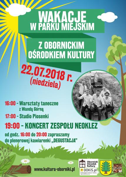 Obornicki Ośrodek Kultury zaprasza na niedzielne spotkania w Parku Miejskim, w ramach których odbędą się koncerty, przedstawienia i warsztaty. Moc atrakcji przewidziana jest zarówno dla dzieci, jak i dla dorosłych. Wśród zaproszonych grup znalazły się: Neoklez, Afrotuba, Feria, The Postman oraz Teatrzyk Gargulec. Dodatkową atrakcją będzie plenerowa kawiarenka „Degustacja”, w której będzie można zakupić zimne i ciepłe napoje, oraz pyszne, zdrowe smakołyki.