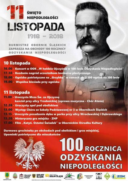 Burmistrz Arkadiusz Poprawa zaprasza mieszkańców i gości do wspólnego świętowania obchodów 100-lecia Odzyskania Niepodległości w Obornikach Śląskich. W ramach obchodów przewidujemy wiele ciekawych wydarzeń.