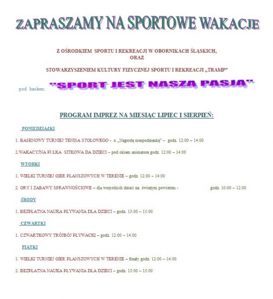 Zapraszamy na sportowe wakacje z Ośrodkiem Sportu i Rekreacji w Obornikach Śląskich oraz Stowarzyszeniem Kultury Fizycznej i Rekreacji "Tramp" pod hasłem: "SPORT JEST NASZA PASJĄ"