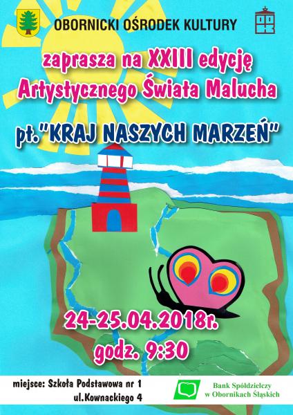 W dniach 24-25 kwietnia 2018r. odbędzie się 23. edycja „Artystycznego Świata Malucha” - gminnego przeglądu dziecięcych programów artystycznych. W tym roku, w którym przypada setna rocznica odzyskania przez nasz kraj niepodległości, organizator – Obornicki Ośrodek Kultury zaprosił dzieci do przedstawienia swojej wizji kraju marzeń.
