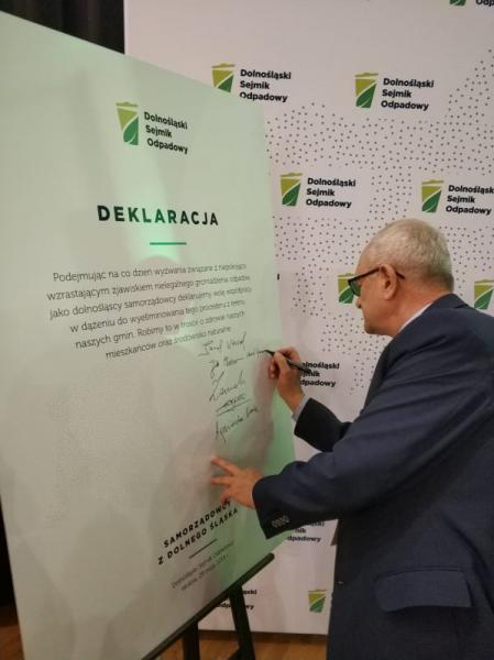 29 maja b.r. Zastępca Burmistrza Henryk Cymerman miał przyjemność uczestniczyć w Dolnośląskim Sejmiku Odpadowym, który odbył się w Wołowskim Ośrodku Kultury. Na to ważne wydarzenie zaproszone zostały władze samorządowe z całego Dolnego Śląska. Głównym celem spotkania było podjęcie współpracy samorządów w skutecznym zwalczaniu zjawiska porzucania niekomunalnych odpadów i nielegalnej działalności gromadzenia odpadów, w miejscach na ten cel nieprzeznaczonych. Jak powszechnie wiadomo, wydarzenia te wpływają negatywnie na zdrowie mieszkańców, pogarszają stan środowiska naturalnego i angażują finanse gmin na usuwanie skutków tego nielegalnego procederu. Zaproszeni włodarze podpisali deklarację o woli współpracy w dążeniu do wyeliminowania tego procederu z terenu gmin.